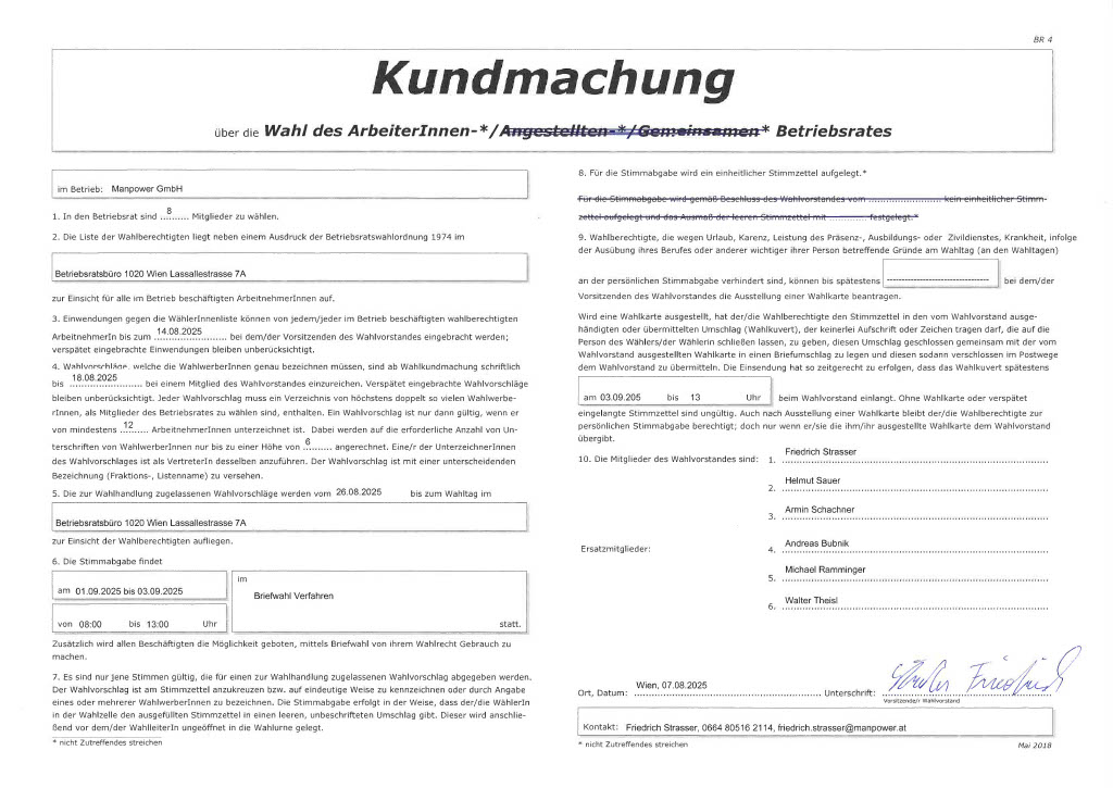Nach der Gruppenversammlung der Arbeiter am 06.08.2025 wurden folgende Punkte der Arbeiterbetriebsratswahl vom Wahlvorstand festgelegt / beschlossen / festgestellt: